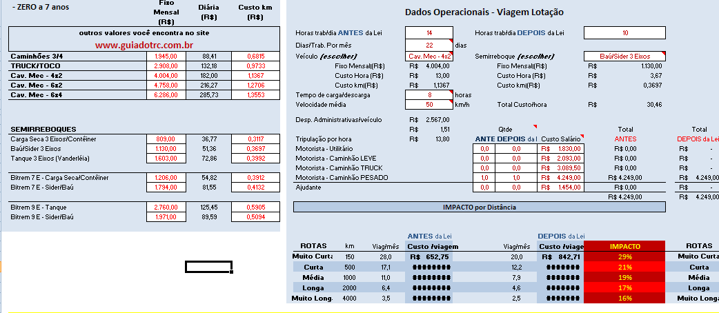 Valdívia lista na planilha os principais veículos usados no TRC, desde o caminhão 3/4 até as CVC’s de 9 eixos, e tendo como base os custos fixos mensais, diários e por Km rodado, estrutura as condições para simulação dos impactos da Lei 12.619/12 sobre o preço do frete rodoviário de cargas, a partir do aumento do número de horas trabalhadas para execução da mesma operação depois da publicação da lei.